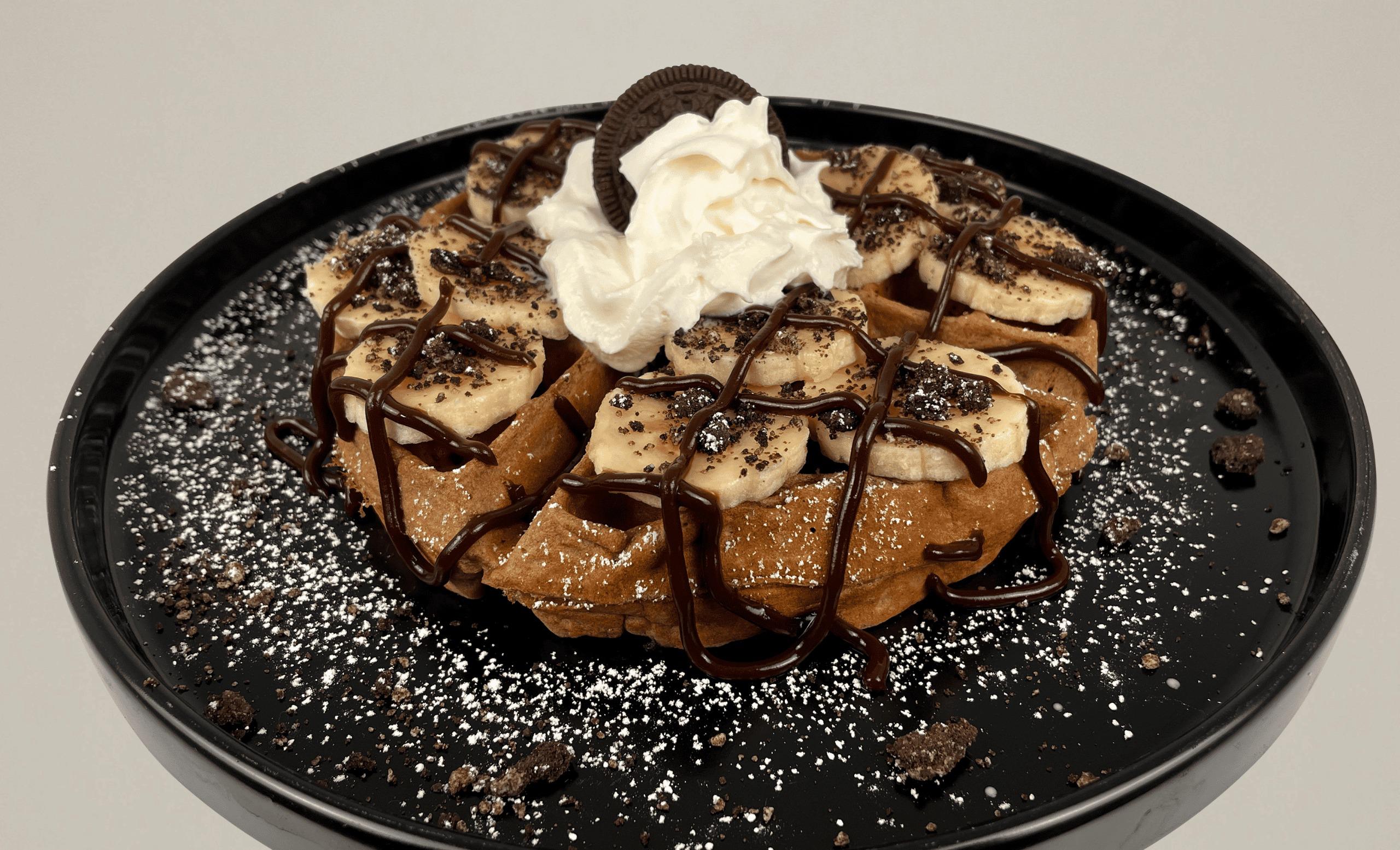 Base sabor chocolate, servido con plátano, galletas oreo, fudge y crema chantilly.